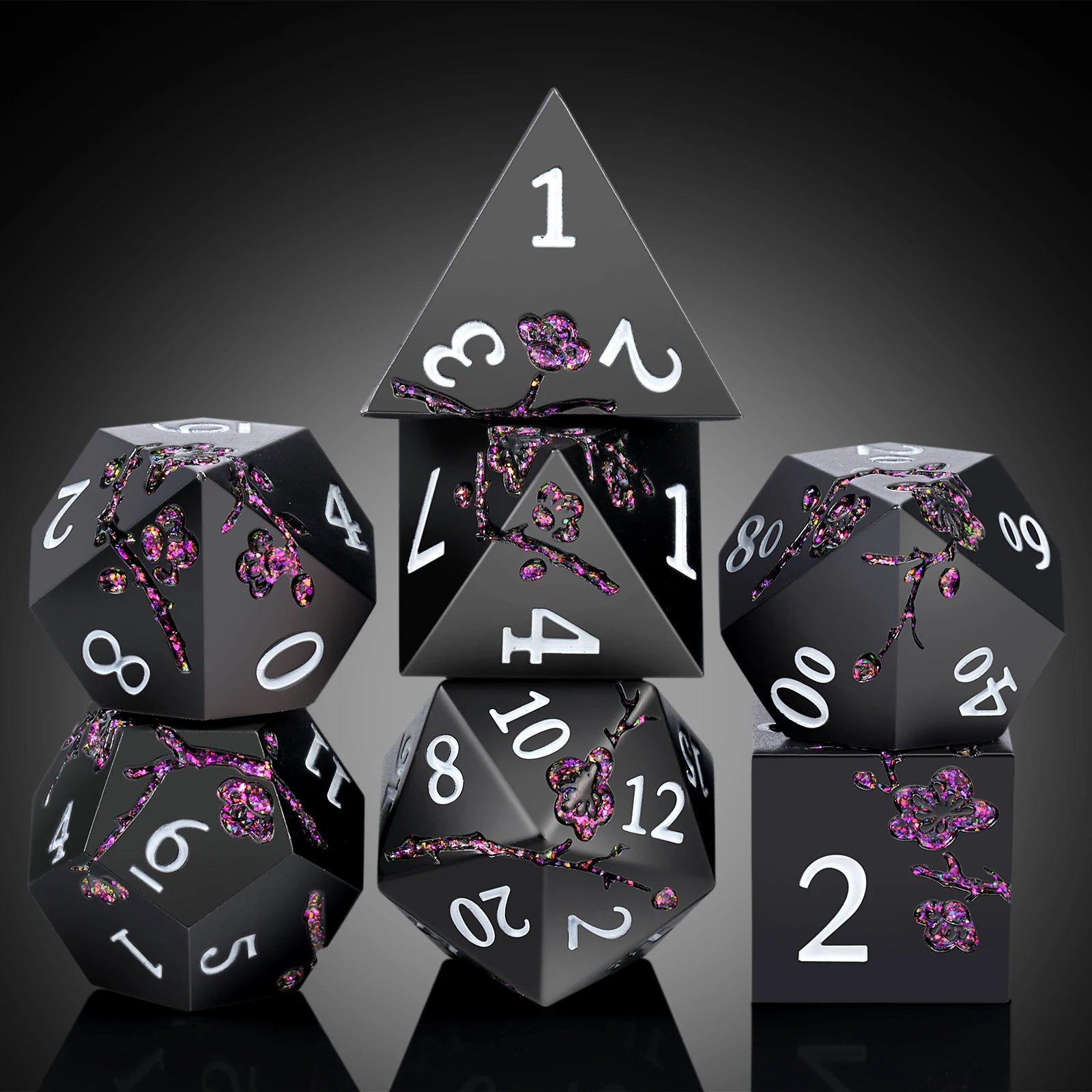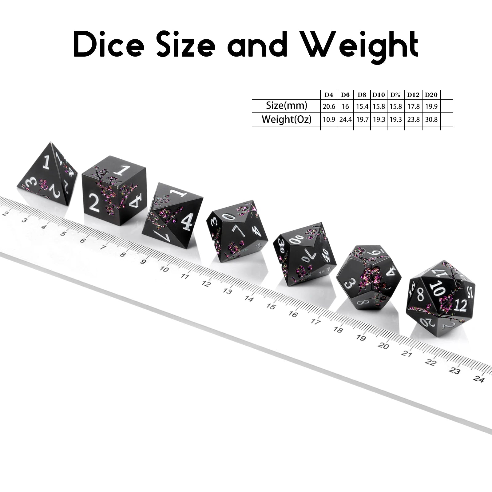Elevate your tabletop gaming experience with this premium 7-piece zinc alloy metal dice set, featuring a striking black finish complemented by vibrant purple accents. Engineered for durability and precision, these dice deliver consistent rolls for Dungeons & Dragons, Pathfinder, and other tabletop RPG adventures. Each die is meticulously crafted from high-quality zinc alloy, ensuring longevity through countless campaigns and gaming sessions. The polished surface provides excellent visibility of numbers, while the weighted construction guarantees fair gameplay. This comprehensive set includes all essential dice: d4, d6, d8, d10, d12, d20, and percentile die. Presented in your choice of elegant velvet storage bag or protective metal box, these dice are as much a collector's piece as they are functional gaming tools. The sophisticated black and purple color scheme makes them instantly recognizable at any gaming table. Whether you're a seasoned dungeon master or a new player, this set combines aesthetic appeal with the reliability serious gamers demand.