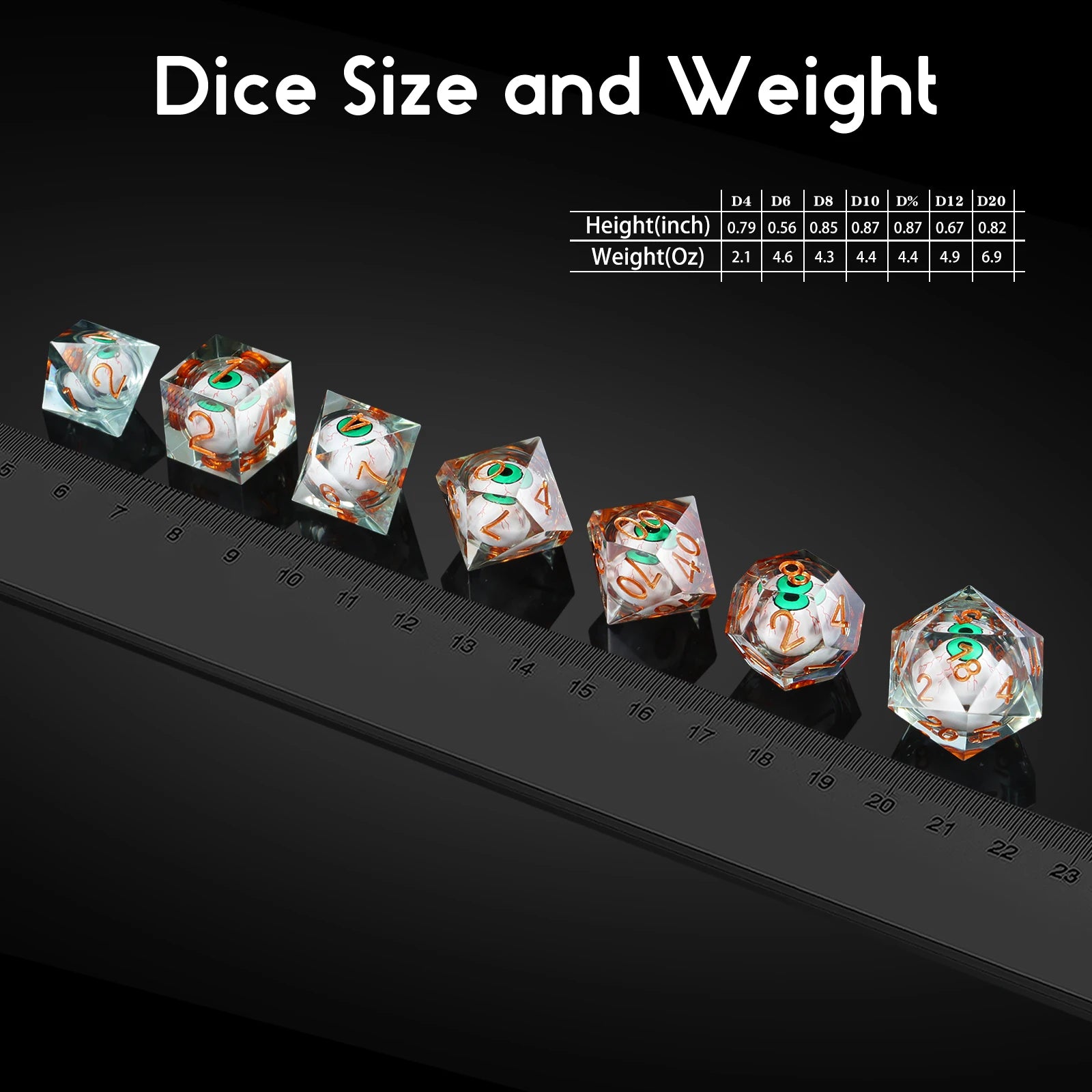 This Dragon Eye Liquid Core Dice Set features vibrant green eyeball centers suspended in a liquid core, creating a captivating effect with every roll. Made from high-quality resin and epoxy, each sharp-edged die ensures precise, consistent rolling. The 7-piece polyhedral set includes all essential D&D dice—D4, D6, D8, D10, D%, D12, and D20—sized at 18mm and weighing 36g. Packaged in a durable metal case, this dice set is perfect for Dungeons & Dragons, tabletop RPG sessions, and collectors seeking unique fantasy-themed gaming accessories.