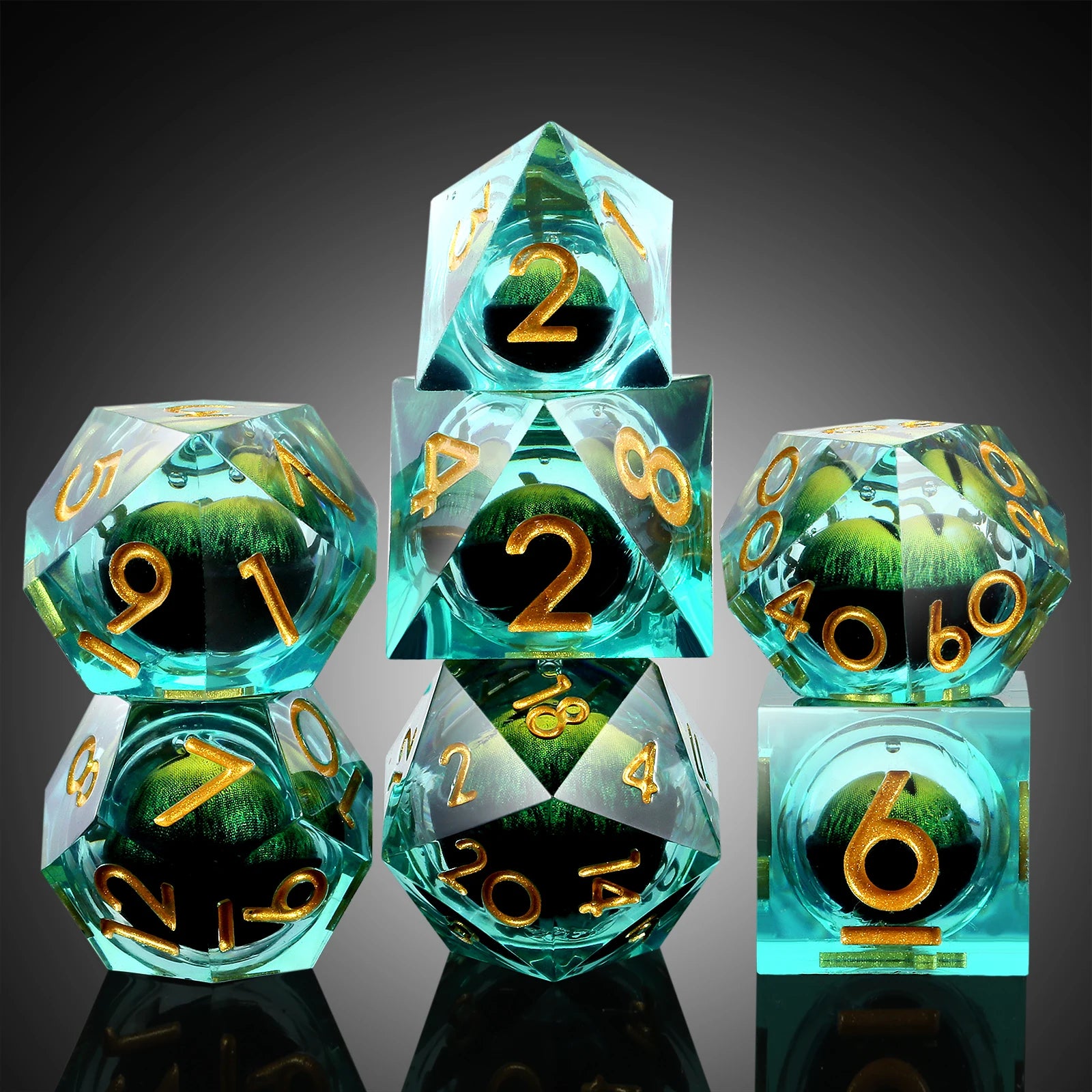 This Floating Dragon Eye Liquid Core Dice Set features vivid dragon-eye centers suspended in a liquid core for a dynamic, eye-catching effect with every roll. Made from premium resin and epoxy, each sharp-edged die ensures smooth and precise gameplay. The 7-piece polyhedral set includes all essential D&D dice shapes, sized at 18mm and weighing 36g, and comes packaged in a sturdy metal case. Ideal for Dungeons & Dragons, tabletop RPGs, or collectors seeking unique, visually striking gaming accessories.