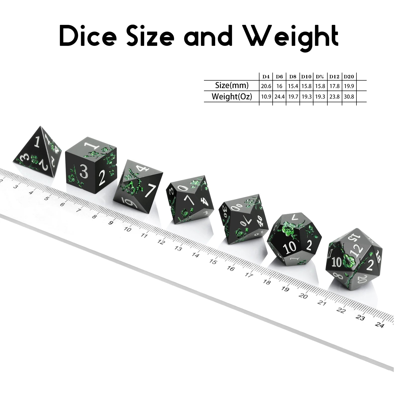 Elevate your tabletop gaming arsenal with this professional-caliber 7-piece metal dice set, engineered from high-grade zinc alloy with meticulous attention to manufacturing precision. The matte black finish provides a refined aesthetic foundation, while the delicate glitter green floral accents add visual sophistication without compromising functionality. Specifically designed for serious Dungeons & Dragons players and competitive tabletop RPG enthusiasts, these dice deliver consistent performance across extended gaming sessions. The substantial metal construction ensures optimal weight distribution for balanced rolls, while the precision-cast design minimizes variance—critical for players who demand reliability. Each die meets exacting quality standards, reflecting professional-grade craftsmanship. The complete 7-piece polyhedral set includes all dice necessary for comprehensive gameplay across multiple RPG systems. Dual storage solutions accommodate different needs: a protective velvet pouch offers convenient portability for gaming groups and convention play, while a reinforced metal box provides secure storage and serves as an impressive display case for collection curation. The durable zinc alloy construction withstands rigorous use without degradation, ensuring long-term performance integrity. Whether you're a game master managing complex campaigns, a competitive player seeking equipment advantages, or a collector investing in premium gaming tools, this set represents exceptional value and professional-grade quality.