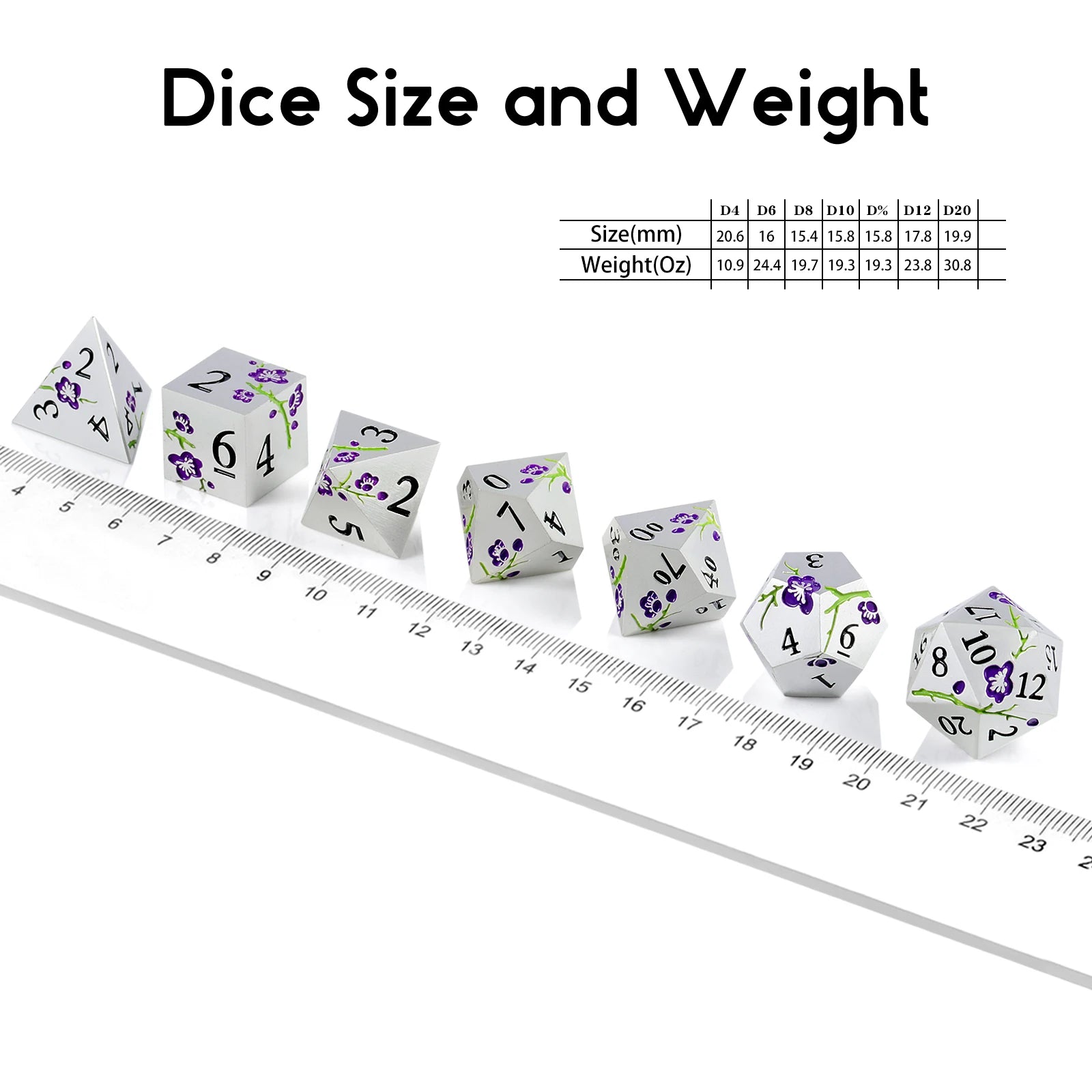 Elevate your tabletop gaming with this exquisite 7-piece metal dice collection, adorned with an elegant plum blossom motif. Crafted from robust zinc alloy, each die offers substantial heft and exceptional accuracy for Dungeons & Dragons, role-playing adventures, and discerning collectors alike. This comprehensive set encompasses all essential polyhedral dice (D4 through D20) and arrives elegantly presented in your choice of sumptuous velvet pouch or refined metal case.