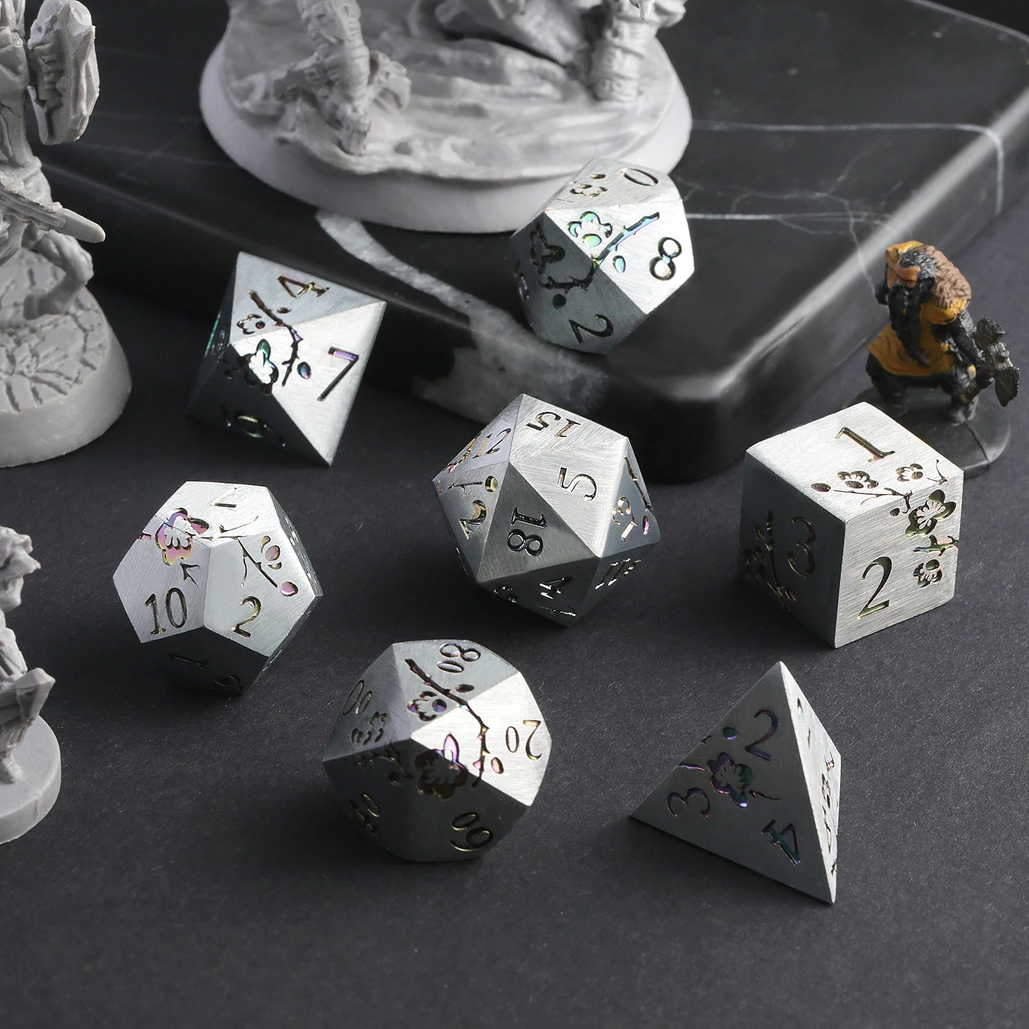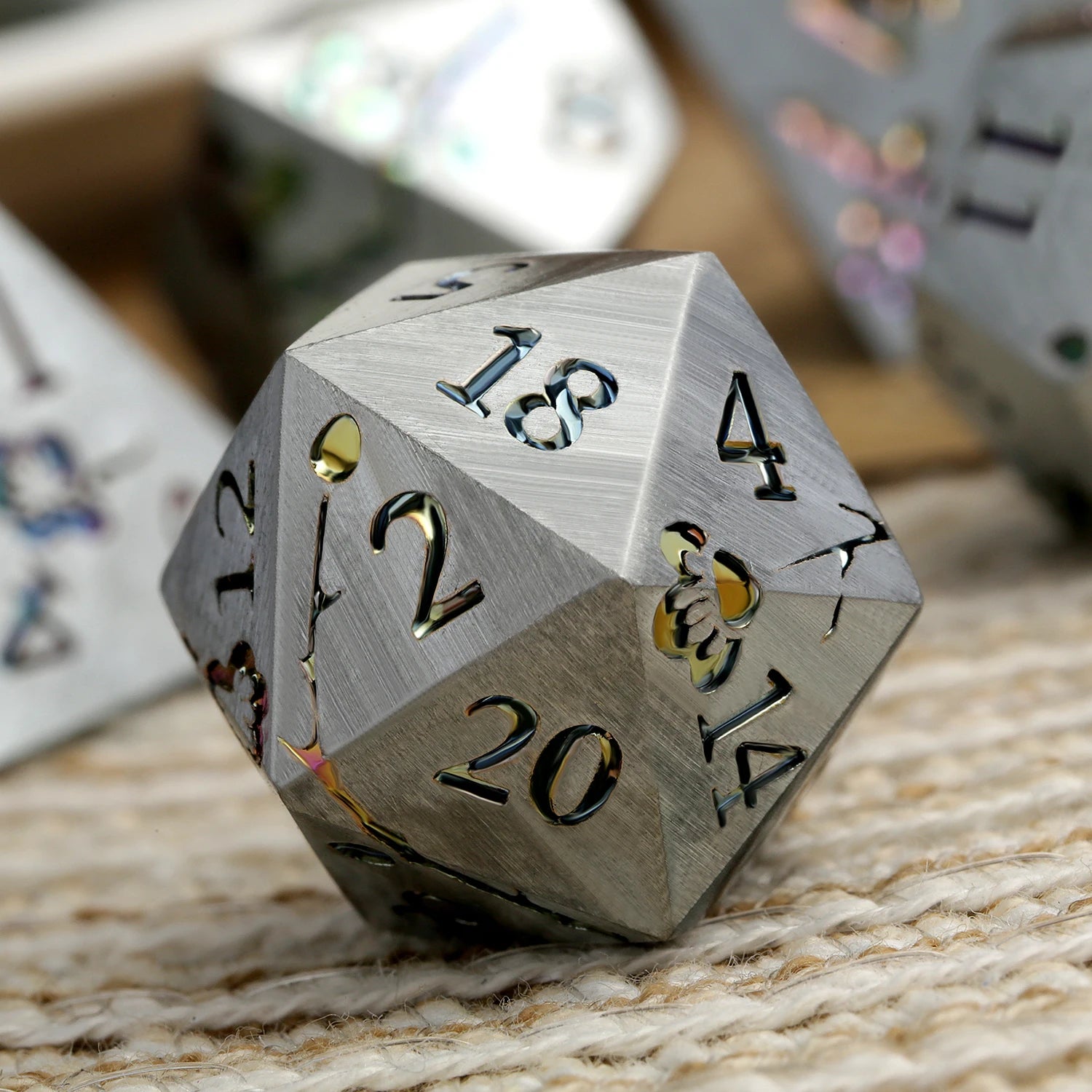 Elevate your tabletop gaming experience with this exquisite 7-piece polyhedral dice set, meticulously crafted from premium zinc alloy. Each die showcases a stunning rainbow gradient that catches the light beautifully, adding visual sophistication to your Dungeons & Dragons, Pathfinder, or RPG sessions. The substantial weight and durability of these metal dice provide a satisfying roll every time. Select your preferred presentation—an elegant velvet pouch for portability, a protective OPP bag for storage, or a refined metal box for display and safekeeping.