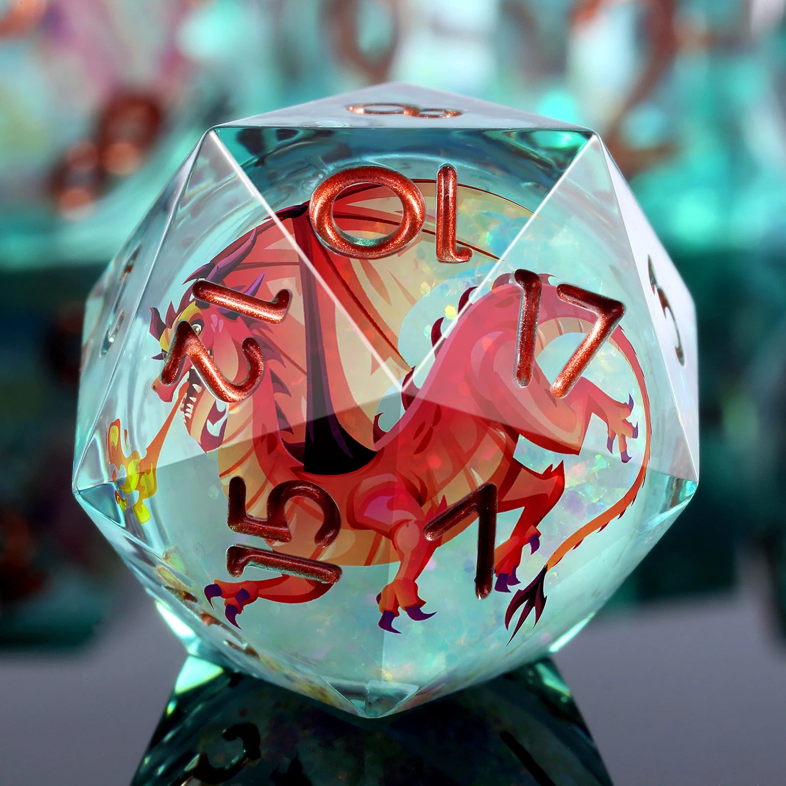 This Shiny Liquid Core Dragon Dice Set brings a dynamic visual effect to every roll with its floating liquid core and transparent resin construction. Each die features a detailed dragon-pattern sticker and sharp edges for improved roll precision, making it an excellent choice for Dungeons & Dragons and other RPG sessions. Crafted from high-quality resin, the set delivers durability, clarity, and a premium feel. It includes all seven standard polyhedral dice used in tabletop games and comes packaged in a sturdy metal case for protection and display. With a size of 18mm and a total weight of 37g, this set is ideal for players looking to enhance their gameplay with both performance and striking aesthetics.
