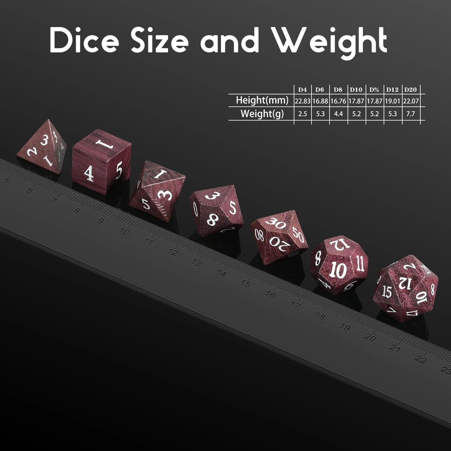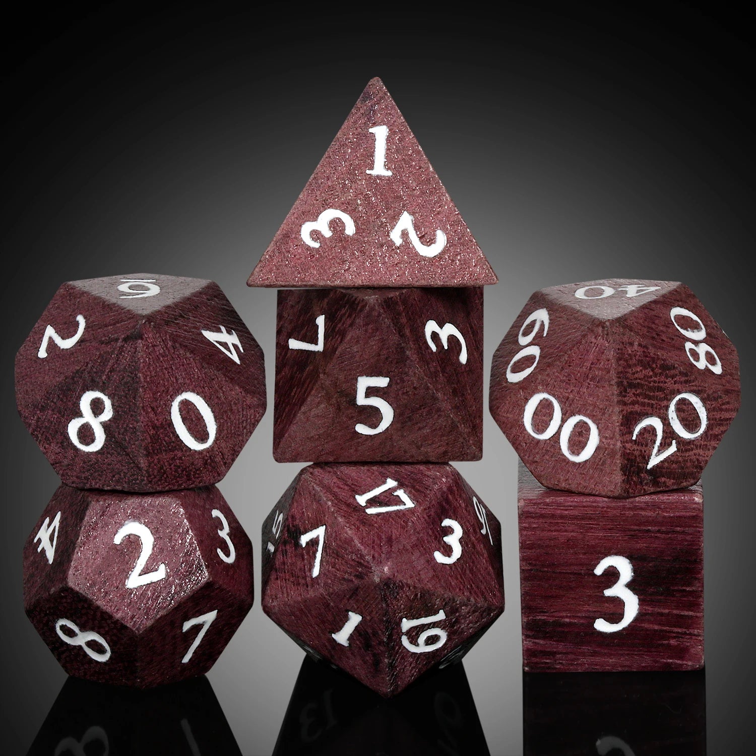 Upgrade your tabletop gaming with our Wood Dice Set. This 7-piece polyhedral dice set is handcrafted from premium Purple Heart wood, perfect for Dungeons & Dragons and other RPG games.